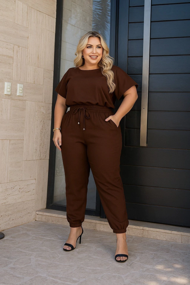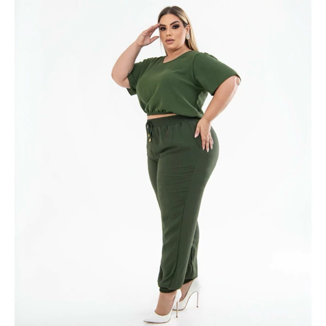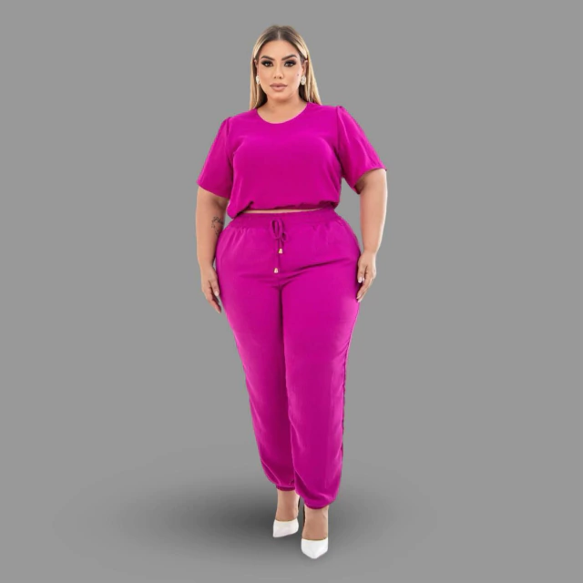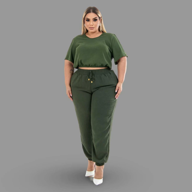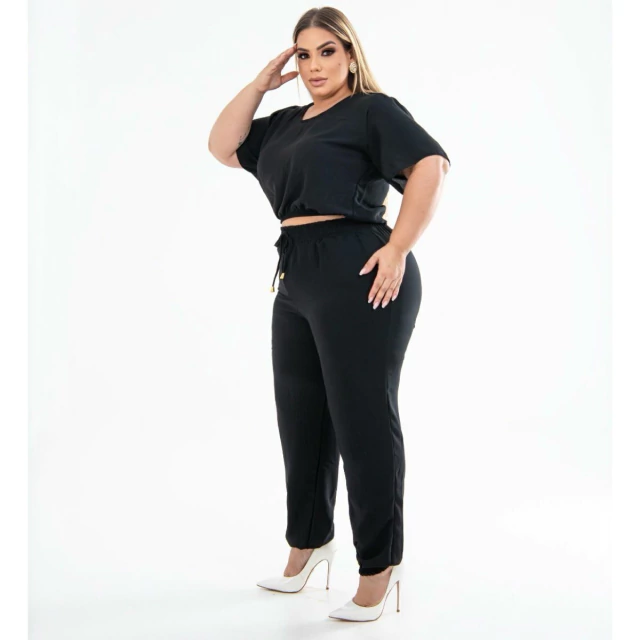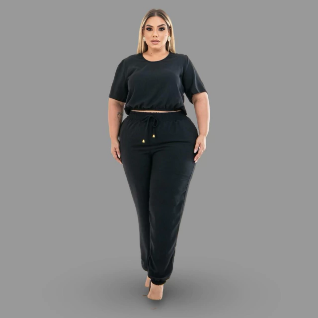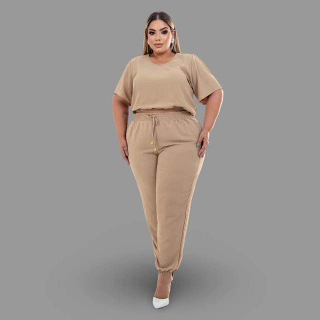 Conjunto de Calça e Blusa, a Calça é modelo jogger, com dois bolsos frontais modelo faca, punhos e cós com elástico, e detalhe de amarração no cós. a blusa com mangas tradicionais, gola redonda e elástico na barra, o comprimento dela é excelente pois fica abaixo do cós da calça.