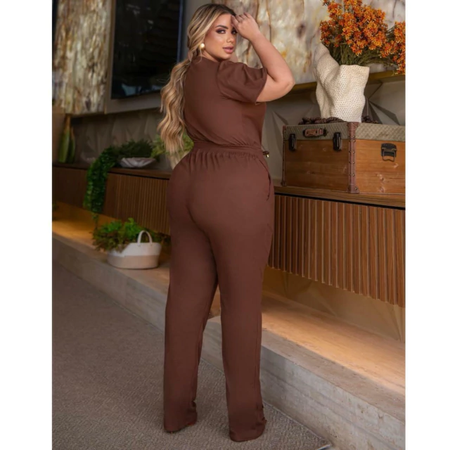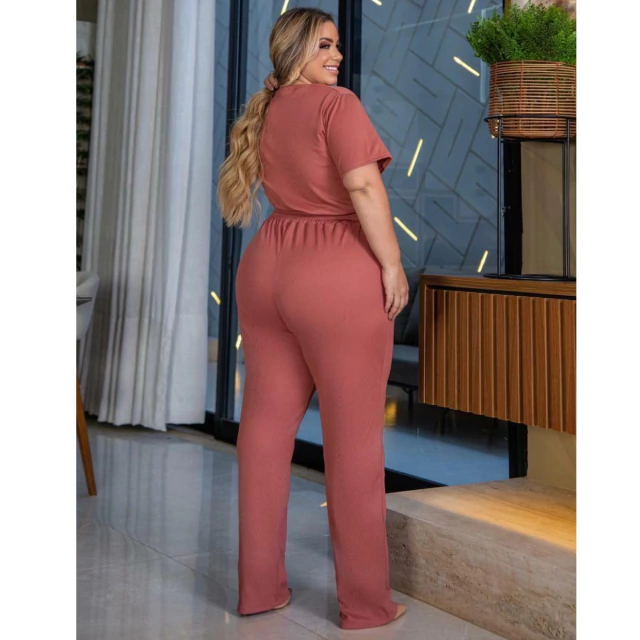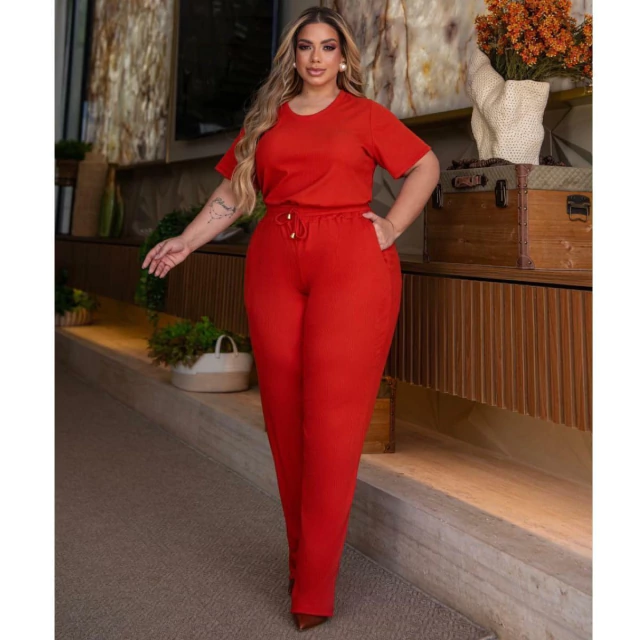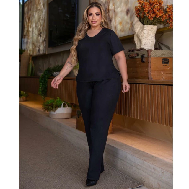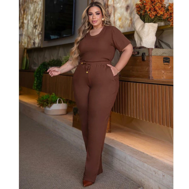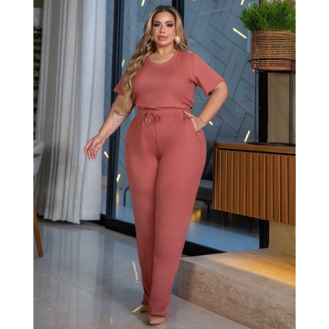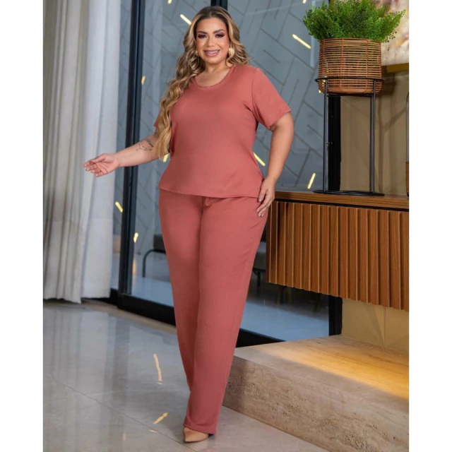 Conjunto de Calça e Blusa, a Calça é modelo soltinho, com dois bolsos frontais modelo faca, e cós com elástico. a blusa com mangas tradicionais, gola redonda , o comprimento dela é excelente pois fica abaixo do cós da calça.