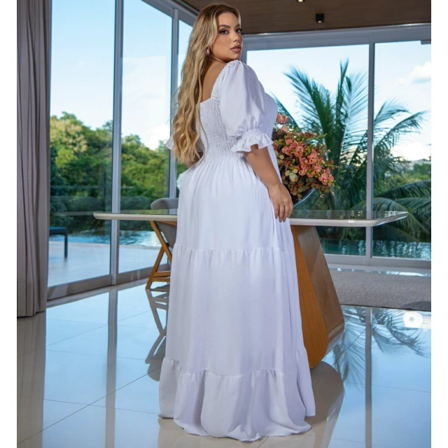 Vestido Longo, confeccionado em tecido Duna . Seu corte trás movimento e leveza na peça, proporcionando estilo e conforto, podendo ser usado tanto durante o dia, quanto durante a noite.