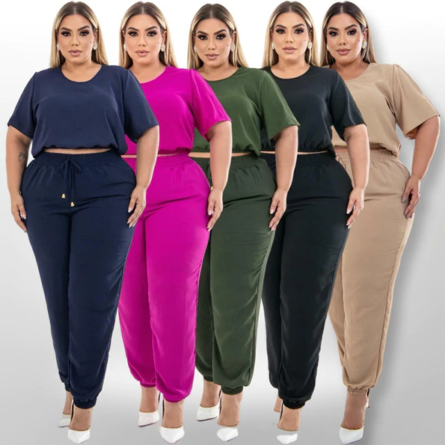 Conjunto de Calça e Blusa, a Calça é modelo jogger, com dois bolsos frontais modelo faca, punhos e cós com elástico, e detalhe de amarração no cós. a blusa com mangas tradicionais, gola redonda e elástico na barra, o comprimento dela é excelente pois fica abaixo do cós da calça.