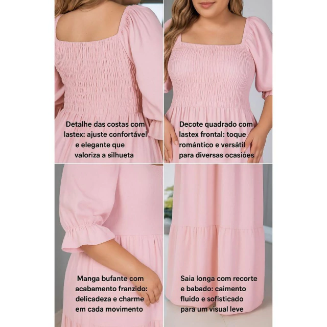 Seu busto possui costuras de lastex no corpo frente e costa, alça com mangas , saia do vestido com modelo longo três marias.