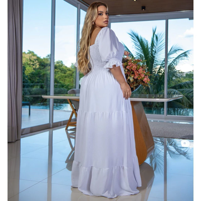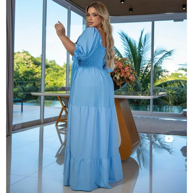 Vestido Longo, confeccionado em tecido Duna . Seu corte trás movimento e leveza na peça, proporcionando estilo e conforto, podendo ser usado tanto durante o dia, quanto durante a noite.